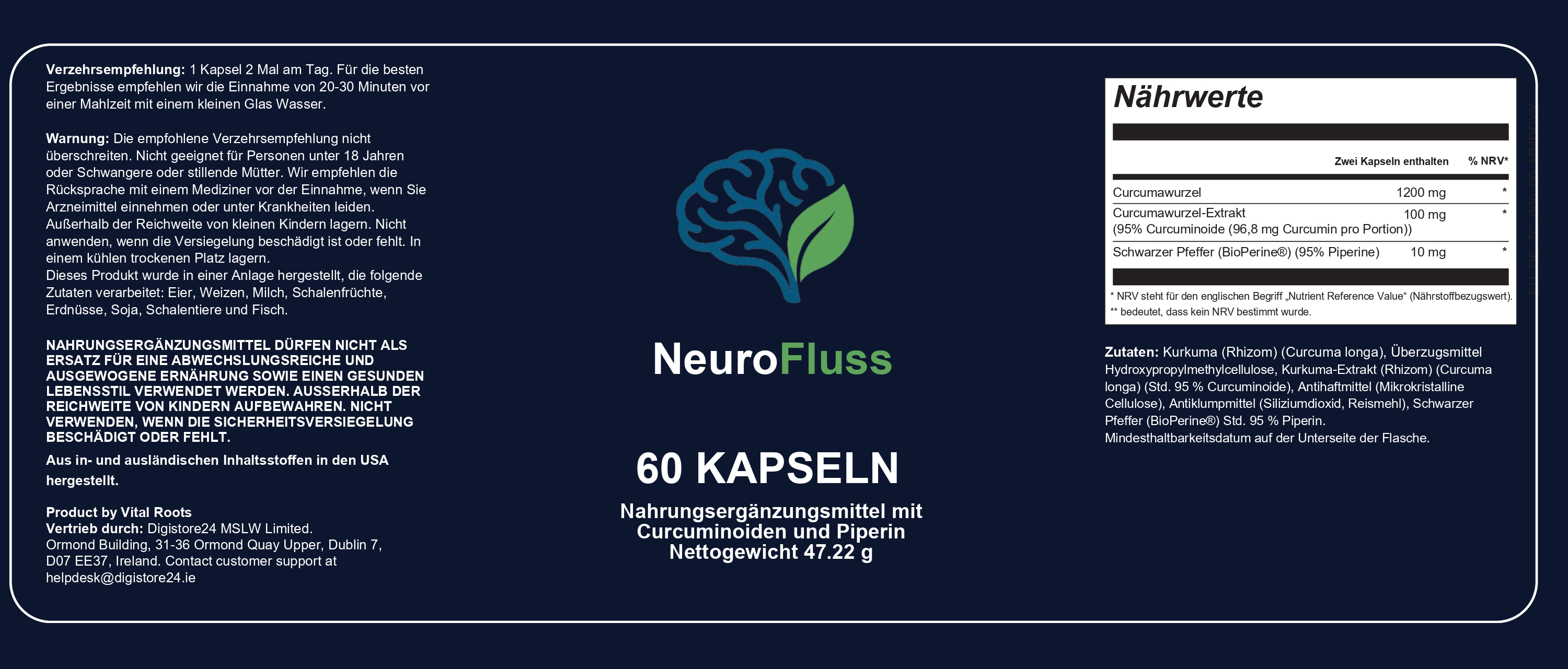 NeuroFluss™ combines Curcumin (from turmeric root) with BioPerine® (standardized black pepper extract) to significantly increase curcumin absorption, allowing your body to fully benefit from its antioxidant and nerve-support properties.